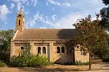 Hans Martin Kuno Moderow (1877-1945), pastor of the Haifa Evangelical Congregation (1908–18),[49] also provided services in Waldheim, at the beginning in the living room of the new house of Waldheim's then mayor Gottlob Weinmann. The Waldheimers saved funds for a church of their own and could thus lay the cornerstone for the church in early 1914. The Haifa-based architect Otto Lutz led the construction works. In 1921, the Evangelical church at Alonei Abba, which still stands today, was inaugurated.[50] The Alon winery, surrounded by a grove of oak trees, is located in the former dairy cooperative (est. 1913).[51]