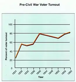 In the 1820s every government office was elected, or chosen by elected officials. After 1848 many states revised their constitutions so that judges were elected to fixed terms, and had to campaign before the voters like everyone else. Unlike other countries, many different offices were elected, with election days staggered so there was little respite from constant campaigning. As the politicians discovered more potential blocs of voters, they worked to abolish the traditional property standards for suffrage. The principles of republicanism seemed to require that everyone be eligible, and indeed actually vote. Several states allowed immigrants to vote before they took out citizenship papers; elsewhere the parties facilitated the naturalization process. By mid-century, practically every adult white male was a potential voter—or indeed, an actual voter, as turnout nationwide reached 81 percent in 1860. America stood in stark contrast with Europe, where the middle classes, peasants and industrial workers had to mobilize to demand suffrage. Late in the century, Americans did create farmer and labor movements, but most were nonpartisan, and those that fielded candidates rarely lasted more than an election or two.[29]