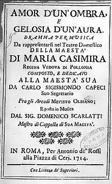 Queen Maria Casimira had taken up residence in Rome in 1699 following the death of her husband Jan III Sobieski and her subsequent exile from Poland. Once in Rome she set up a court and became an active figure the city's musical life. In 1709, Domenico Scarlatti succeeded his father Alessandro as her court composer. His librettist, Carlo Capece, was her private secretary and court poet. Amor d'un'ombra e gelosia d'un'aura premiered at Maria Casimira's private theatre in the Palazzo Zuccari in January 1714 and proved to be the last of the several operas which Scarlatti had composed for her. Five months after the premiere, she departed for France, leaving a string of debts behind her.[2]