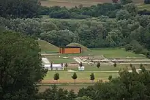 Another example of a richly furnished female grave is a grave chamber of the necropolis of Göblingen-Nospelt (Luxembourg), containing an amphora of fish sauce (garum fish sauce from Gades was a widely popular food seasoning), a bronze saucepan with strainer lid, a bronze cauldron, two bronze basins with a bronze bucket, a Terra sigillata plate, several clay cups and jugs, a mirror and eight fibulae.[10]