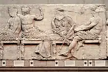 Ancient Greek furniture was typically constructed out of wood, though it might also be made of stone or metal, such as bronze, iron, gold, and silver. Little wood survives from ancient Greece, though varieties mentioned in texts concerning Greece and Rome include maple, oak, beech, yew, and willow.[56] Pieces were assembled using mortise-and-tenon joinery, held together with lashings, pegs, metal nails, and glue. Wood was shaped by carving, steam treatment, the lathe, and furniture is known to have been decorated with ivory, tortoise shell, glass, gold, or other precious materials.[57] Similarly, furniture could be veneered with expensive types of wood to make the object appear more costly,[58] though classical furniture was often pared down in comparison to objects attested in the East, or those from earlier periods in Greece.[35]