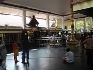 The temple is built on a 40-cent land near the Visveswarayya Tower.[2] The temple has shrines for Ganesha, Muruga, Durga, Anjaneya, Navagrahas and Nagaraja.[1] The main sanctum of Lord Ayyappa faces west with Lord Ganesha and Lord Subramanya to the left and Goddess Durga to the right, all facing east. The Navagraha shrine is located on the southeast corner of the temple and the Anjaneya shrine is located in the southwest corner, facing east.[2] The main door at the entrance is covered with brass plates. There is an auditorium, named after Sri Adisankara, covering about 3,600 sq ft,[2] which can accommodate about 1,000 persons,[1] for conducting spiritual and cultural programmes and discourses. The design of the auditorium involves the Koothambalam style found in Kerala temples.[2]