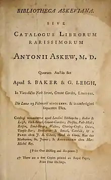 After the death of Askew, the library of nearly 7,000 books,[5] was sold at an auction which lasted from 13 February to 7 March 1775.[7] William Munk stated that the library collection was sold beginning 19 February 1775 by Baker and Leigh; the sale continued for 19 days.[4] The catalogue of the collection was sold at one shilling and sixpence, with a few copies on royal paper at four shillings...[7] Over 80% of the sale consisted of classical texts in Latin and Greek.[9] The purchasers of Askew's books at the auction included the anatomist William Hunter, the British Museum and the kings of England and France.[2] Books purchased by George III of England in 1762,[10] and the Second Folio of Shakespeare bought in 1800, were added to the King's Library.[11]