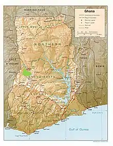 Atlantic trade routes were more heavily used at the end of the 18th century, and led to a decline in the use of trans-Saharan routes.[2] During this time, a stronger focus was placed on gold and minerals, and eventually slaves through the Atlantic slave trade.[2] This time is also associated with periods of warfare and conflict with a group known as the Asante, who had a large influence on day to day stability and productiveness of those living in the Banda District.[2]