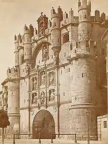 Arco de Santa María in Burgos, Spain, is to one of the twelve medieval gates the city had during the middle ages. It was rebuilt by Charles V, Holy Roman Emperor during the 16th century after the local rulers of the city supported him during the Revolt of the Comuneros. On the facade of the arch appear people of importance to the city of Burgos and Castile, such as Diego Rodríguez Porcelos, the founder of the city; Jueces de Castilla; Laín Calvo and Nuño Rasura; El Cid; Fernán González; and Charles V himself.[1]