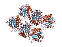 In molecular biology, members of the ArgJ protein family are bifunctional protein that catalyses the first (EC 2.3.1.35) and fifth steps (EC 2.3.1.1) in arginine biosynthesis.[1] The structure has been determined for glutamate N-acetyltransferase 2 (ornithine acetyltransferase), an ArgJ-like protein from Streptomyces clavuligerus.[2]