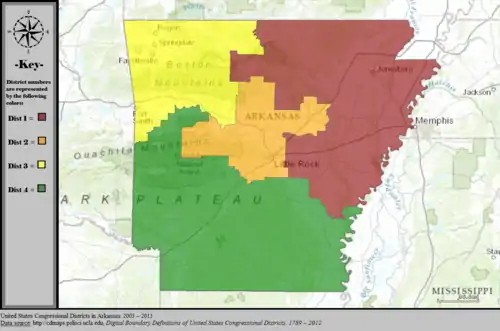 Table of United States congressional district boundary maps in the State of Arkansas, presented chronologically.[3] All redistricting events that took place in Arkansas between 1973 and 2013 are shown.