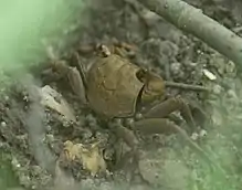While the wharf crab is often deemed a detritivore, it is highly omnivorous and will supplement a detritus diet with microscopic insects and invertebrates.[8] In mangrove habitats wharf crabs are a key component as omnivores in the food chain, they serve as carnivores, herbivores, and detritivores.[6] Some examples of what the wharf crab would eat in a Mangrove habitat include, insects, partially decomposed Avicennia (Black Mangrove), and leaves from Mangroves or other maritime vegetation.[6] When feeding on plant matter wharf crabs will prioritize softer plants over plants with a tougher exterior.[9] When both plant and animal food sources are readily available the wharf crab will choose the animal prey.[6] The diet of Armases cinereum coincides directly with the environment in which it is found and what the prominent food availability is in that environment. Consequently, this diverse diet also allows the species to live at relatively high population densities across a large margin of coastal ecosystems.[6]