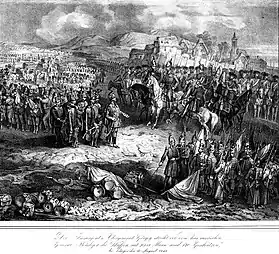 Kossuth, who did not want to give the supreme command to Görgei, conferred it on the Polish general Henryk Dembiński. Many officers from Görgei's Army of the Upper Danube (György Kmety, Lajos Aulich) were astonished at Kossuth's decision and sought to protest, but Görgei ordered them to accept it.[25] One of the first decisions of the new commander was to order many of the Hungarian units, under the lead of Görgei and Klapka, to retreat, enabling the Austrian troops of General Franz Schlik to escape from their encirclement.[21] On 25–27 February 1849, Dembiński, after making mistake after mistake, lost the Battle of Kápolna (in which Görgei's VII corps could not participate; because of Dembiński's poor deployment, the VII corps arriving at the battlefield only after the battle ended).[26] The Hungarian officers revolted against the Polish commander and demanded his dismissal and that a Hungarian general be put in his place.[27]