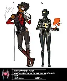 Kris Anka's concept art of a redesigned Ashley Barton / Spider-Kingpin and Felicity Hardy / Scarlet Spider (wearing the Spider-Armor MK II) for Spider-Man: Across the Spider-Verse.