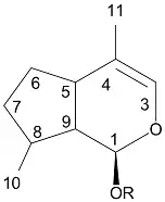 Aucubin is a monoterpenoid based compound.[6] Aucubin, like all iridoids, has a cyclopentan-[C]-pyran skeleton.[6] Iridoids can consist of ten, nine, or rarely eight carbons in which C11 is more frequently missing than C10.[6] Aucubin has 10 carbons with the C11 carbon missing. The stereochemical configurations at C5 and C9 lead to cis fused rings, which are common to all iridoids containing carbocylclic- or seco-skeleton in non-rearranged form.[6] Oxidative cleavage at C7-C8 bond affords secoiridoids.[7] The last steps in the biosynthesis of iridoids usually consist of O-glycosylation and O-alkylation. Aucubin, a glycoside iridoid, has an O-linked glucose moiety.