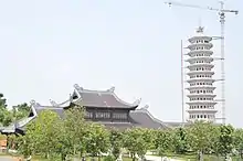 The New Bai Đính Temple (Bái Đính Tân Tự) encompasses an area of 700 hectares, located on Ba Rau hills, near the Hoàng Long River. This is a large complex which includes many structures built over several phases starting in 2003 and finally completed in 2010.[2] The temple's architecture follows traditional lines, consisting of large halls, courtyards and enclosures. The huge scale of Bai Dinh makes it strikingly different from previously built Vietnamese Buddhist pagodas, however. The largest structure, the Tam Thế Hall, rises to 34 m at its roof ridge and measures over 59 m in length.[2] The construction materials include locally quarried stone and timber from Ninh Bình and tiles from Bát Tràng (reinforced concrete was also employed owing to the scale of construction). The temple adheres to traditional Vietnamese design aesthetics with its curve finials and corner eaves soaring outward and upward, resembling a phoenix's tail. Artisanal works from local handicraft villages were selected for the interior, with bronze sculptures from Ý Yên, stone carvings from Ninh Van, wood carpentry from Phú Lộc, and embroidery from Ninh Hải.