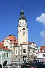 The town hall is a main landmark of the Mírové Square in the historic town centre. It is an Art Nouveau building, built in 1908–1911.[3] The Marian column and the fountain on the square are from the second half of the 17th century.[4]