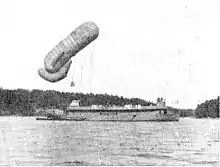 In 1849 the Austro-Hungarian naval ship SMS Vulcano took part in the first aggressive use of balloons in warfare,[1][2] serving as a balloon carrier (the precursor to the aircraft carrier)[3] in the first offensive use of air power in naval aviation.[4][5][6] Austrian forces besieging Venice attempted to float some 200 paper hot air balloons, each carrying a 24- to 30-pound bomb that was to be dropped from the balloon with a time fuse over the besieged city. The balloons were launched mainly from land; however, some were also launched from Vulcano. The Austrians used smaller pilot balloons to determine the correct fuse settings. At least one bomb fell in the city; however, due to the wind changing after launch, most of the balloons missed their target, and some drifted back over Austrian lines and the launching ship Vulcano.[7][8][9]