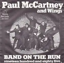 "Band on the Run", backed with "Nineteen Hundred and Eighty-Five", was released in America on 8 April 1974 as the follow-up single to Paul McCartney and Wings' top-ten hit "Jet". The song was a smash hit for the band, becoming McCartney's third non-Beatles American chart-topping single, and the second with Wings.[1] The single was later released in Britain (instead backed with "Zoo Gang", the theme song to the television show of the same name), reaching number 3 on the British charts.[2] The song reached number 1 in both Canada and New Zealand. The song was also a top 40 single in multiple European countries, such as the Netherlands (number 7),[16] Belgium (number 21),[17] and Germany (number 22).[18]