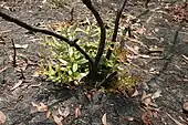 New stems arising from the woody lignotuber after bushfire, also showing the rusty new growth, Lane Cove National Park