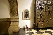 Fragment of the epitaph board of Cyprian Kamil Norwid and an urn with soil from his grave; Crypt of National Bards at Wawel Castle in Kraków (2011)