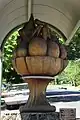 Carved by Fred Alwahan from the trunk of a red oak on Mayday Road, Batlow, NSW in 1994,[13] it stands over two metres tall. The plaque (inset) informs that Alwahan donated the work as a tribute to the town's pioneers.