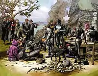 In November 2013, Snyder released a teaser image by Fabok, titled "Happy Batsgiving", inspired by Jean Leon Gerome Ferris' The First Thanksgiving 1621.[2] The image was intended to be "full of Easter eggs and teases" for the series.[3] In December 2013, Seeley stated that Snyder and Tynion created the overarching plot threads of the series to keep each writer progressing, but then further broke the whole story down to different genres for each writer to work in.[4] Fawkes also added that each writer takes turns being the "lead" on the issue, while the others continue to contribute their parts to the issue.[5]