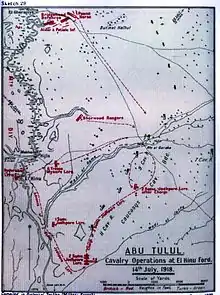 The Battle of Abu Tellul (called the Affair of Abu Tellul by the British Battles Nomenclature Committee[6]) was fought on 14 July 1918 during the Sinai and Palestine Campaign of World War I after German and Ottoman Empire forces attacked the British Empire garrison in the Jordan Valley. The valley had been occupied by the Egyptian Expeditionary Force (EEF) from February 1918 when Jericho was captured. Following two raids east of the River Jordan by the EEF the first in March and second in April the defence of the valley became the responsibility of the Desert Mounted Corps.