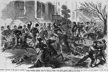 The Union force rode west through town firing some shots at random.[15] According to many of the accounts of the battle, the Union troopers fired at a man emerging from the hotel in town, who happened to be Lt. Col. Ewell, and wounded him in the shoulder.[15][20] Regardless of the exact location where Ewell was wounded, he was the first Confederate field grade officer wounded in the war.[21]