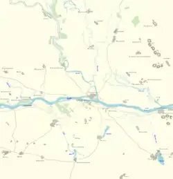 Colloredo's division took up a position at Csallóközaranyos in the Csallóköz and with its outposts occupied Szentpál, Örsújfalu (today both are parts of Komárno), and Nemesőrs, then Keszegfalva and Vízvár.[6] The connection with the right bank of the Danube was assured at Pusztalovad by the “Ceres” steamship, and at Nagylél (today part of Csallóközaranyos), a pontoon bridge was about to be constructed.[6] From Nobili's division, the Teuchert brigade occupied Ács and the Ács forest, while the Lederer brigade Herkály farm (Puszta-Herkály).[6] The Jablonowski brigade was at Pusztacsém (Csém farm); the Chizzola division at Grebic and Billeg; the Jablonski brigade at Mocsa, while the Barco cavalry brigade was camped at Ács.[6] The Russian detachment under Lieutenant General Pavel Grabbe took up positions at Hetény, Kurtakeszi, and Komáromszentpéter.[6] The besiegers started to rebuild their trenches and earthworks from the Ács forest, Csém, Herkály and Csallóköz, which were destroyed by the Hungarians after they managed to relieve the fortress in the Battle of Komárom from 26 April 1849.[6]