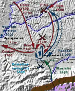 With his characteristic steadfastness and speed, Bem cut the imperial front in two on 23 December near Dés, first driving Colonel Karl von Urban's border guard regiments into Bukovina and then turning south to win a decisive victory over Lieutenant General Anton Puchner, the main commander of the Austrian armies from Transylvania.[4] In January 1849, the Honvéd Army liberated Székely Land, and then defeated Puchner, who was in an increasingly desperate situation, near Szőkefalva.[4] The imperial commander-in-chief was forced back to his headquarters in Nagyszeben, but Bem tried unsuccessfully to take the city on 21 January in the First Battle of Nagyszeben. This was Bem's first defeat in Transylvania.[4] After his victory at Nagyszeben, Puchner launched an attack, but Bem defeated him in the Battle of Szelindek on 24 January, and forced him to retreat back to where he came from.[1] After this successful battle, Bem sent Major Farkas Kemény with the 11th and 55th Battalions, 1 company of the Mátyás Hussars and a six-pounder battery to Déva via Vízakna-Szerdahely-Szászsebes and Szászváros, to wait there for the relief troops sent from Hungary then return in quick marches, or to wait at Déva for Bem along the Transylvanian-Hungarian border in the case if he was forced to retreat by Puchner.