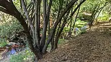 The Spanish called the creek Arroyo de la Presa, meaning "creek of the dam", and it was part of the Rancho Cañada de Raymundo land grant.[5] A foreclosure sale in 1861 records, "Arroyo de la Presa, now called by the Americans Bear Gulch...which heads near the summit of the mountains (Sierra Morena)".[6] In 1850, Mexican war veteran James H. Ryder was working for Dr. Robert Orville Tripp’s lumber company, which used oxen to haul the logs to what is now Redwood City, where they were then floated to San Francisco. When two oxen went missing, Ryder went looking for them only to be attacked by a California grizzly bear (Ursus arctos californicus) with two cubs when he stopped for a drink at a creek. Severely mauled, he survived — and the creek became known as Bear Gulch Creek and James Ryder became known as "Grizzly" Ryder.[7][8][9]