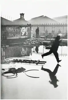 The spontaneous photograph was taken by Cartier-Bresson at the Place de l'Europe, outside the Saint-Lazare train station, in Paris, with his portable Leica camera. In this case, he took aim to a man who leaps over a wet ground, without touching it, while his shadow is reflected beneath him, near a fallen ladder. Behind him posters in a wall advertise dancers, that seems to echo the man's movement, and the Railowski Circus. The man is forever framed in the air, without touching the water. This was one of the few photographs that the artist cropped. Cartier-Bresson explained that "There was a plank fence around some repairs behind the Gare [Saint] Lazare, and I was peeking through the spaces with my camera eye. This is what I saw. The space between the planks was not entirely wide enough for my lens, which is the reason the picture is cut off on the left."[3][4][5]
