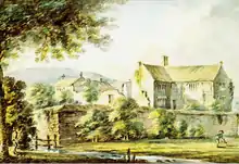 "Ash, ancient seat of the Drakes", watercolour dated 13 February 1795 by Rev. John Swete (1752–1821) of Oxton House, Devon. Devon Record Office 564M/F7/129. It was then in use as a farmhouse. This is the house re-built by Sir John Drake, 2nd Baronet (1647–1684) after its near destruction during the Civil War. The building at left is a chapel[1]
