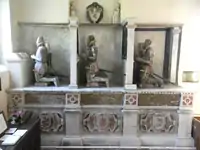 Monument to the Drake family of Ash, south aisle of Musbury Church. It depicts the following persons: left: John VI Drake (d. 1558), with his wife Amy Grenville (d. 1577); centre: Admiral Sir Bernard Drake (c. 1537 – 1586), his son, with his wife Gertrude Fortescue (d. 1601); right: John VII Drake (d. 1628), who erected the monument in 1611, son of Sir Bernard, with his wife Dorothy Button (d. 1631). Also shown four times are the arms of Drake: Argent, a wyvern wings displayed and tail nowed gules. Gilded inscribed biographical tablets appear under each couple of kneeling figures