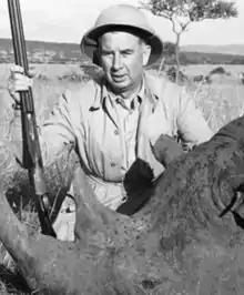 Brooks was a keen hunter and shot animals across the United States, Alaska, Canada, and Mexico.[2][4] Brooks traveled with his family to Kenya in 1947 for a hunting expedition with his wife, Virginia, and 14-year-old daughter, also called Virginia.[5] They were accompanied by two white big-game hunters and fifteen African bearers and covered a distance of 4,000 miles (6,400 km).[4] During the expedition Brooks' daughter shot a lion, cheetah, rhino and other game.[4] She killed an elephant with four shots from within 25 yards (23 m) distance and was thought to be the youngest girl to have shot an elephant dead in Kenya.[4][5] Virginia stated "I have confidence in myself. I didn't find anything to be afraid of. It was something I've always lived for" and planned to mount the animal's head and make its feet into wastebaskets.[4][5] The expedition featured as a story in Life magazine on September 29, 1947, with photographs of Brooks' daughter stood next to her kills.[4] The feature prompted Henry Fairfield Osborn Jr., president of the New York Zoological Society, to write to the magazine to lament the killing of the animals.[4] Brooks' wife did not hunt and said "Heavens, I couldn’t hit the side of a barn."[5]