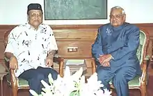 He was introduced to Kalpana Lajmi in the early 1970s by his childhood friend and India's top tea planter Hemendra Prasad Barooah in Kolkata.[20] Her first feature film Ek Pal with music score by Hazarika was produced by Barooah.[21] Subsequently, Lajmi began assisting him professionally and personally till the end of his life.[22][23][24] In the period after the release of Ek Pal (1986) until his death, Bhupen Hazarika mainly concentrated on Hindi films, most of which were directed by Kalpana Lajmi. Ek Pal (1986), Rudaali (1993) and Daman: A Victim of Marital Violence (2001) are major films of this period. Many of his earlier songs were re-written in Hindi and used as played-back songs in these films. These songs tried to cater to the Hindi film milieu and their social activist lyrics were browbeaten into the lowest common denominator.[25] He served as an MLA (Independent) during 1967–72 in the Assam Legislative Assembly from Naoboicha Constituency.[26] He contested as a Bharatiya Janata Party candidate in the 2004 Lok Sabha elections from the Guwahati constituency, persuaded by Chandan Mitra via Kalpana Lajmi[27] which he lost to the Indian National Congress candidate Kirip Chaliha.