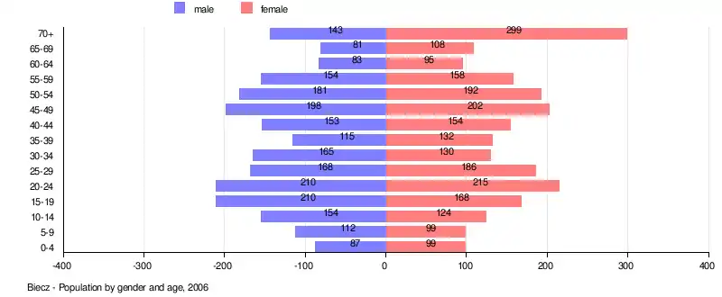In Biecz there are 107 women for every 100 men. The number of women in an age group is greater than the number of men for all age groups except the following: 5-19, 30–34, and 40–44.[27]