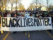 The movement began in July 2013, with the use of the hashtag #BlackLivesMatter on social media after the acquittal of George Zimmerman in the shooting death of African American teen Trayvon Martin 17 months earlier in February 2012. It became nationally recognized for street demonstrations following the 2014 deaths of two more African Americans, Michael Brown—resulting in protests and unrest in Ferguson, Missouri, a city near St. Louis—and Eric Garner in New York City.[10][11] Since the Ferguson protests, participants in the movement have demonstrated against the deaths of numerous other African Americans by police actions or while in police custody. In the summer of 2015, Black Lives Matter activists became involved in the 2016 United States presidential election.[12] The originators of the hashtag and call to action, Alicia Garza, Patrisse Cullors, and Opal Tometi, expanded their project into a national network of over 30 local chapters between 2014 and 2016.[13]