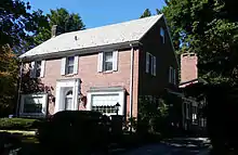 Carl W. Miller House; c. 1926; 32 Balton Road, Providence, RI; A two-and-a-half-story, brick-clad, Modern Colonial house with a central recessed doorway framed by pilasters and imposts with rosettes and an entablature broken by an architrave with a plinth block above, and flanked by bay windows. Miller was a professor at Brown University.