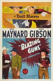 Blazing Guns is a 1943 American Western film directed by Robert Emmett Tansey and written by Frances Kavanaugh and Gina Kaus. The film stars Ken Maynard, Hoot Gibson, LeRoy Mason, Emmett Lynn, Weldon Heyburn and Roy Brent. The film was released on October 8, 1943, by Monogram Pictures.[1][2][3]