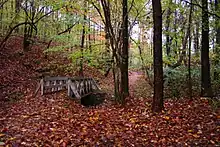 The park was situated on 7.43 acres (3 ha) at an elevation of 732 feet (223 m)[1] on the northern edge of the Kanawha River valley. It was bound by forested hills to its west and east, the confluence of Finney Branch and an unnamed stream in a hollow to its north, and the northern end of Pinewood Drive to its south.[5][6][7] Finney Branch is a tributary stream of the Kanawha River, which flows 1.22 miles (2 km) southwest of the park's location.[6][9] Dutch Hollow, formed by a Finney Branch tributary, is approximately 0.59 miles (1 km) east of the park's location and is the site of the Dutch Hollow Wine Cellars, presently located within Dunbar's Wine Cellar Park.[5][10][11] The former park land is covered in secondary forest consisting of tulip poplar (Liriodendron tulipifera), several species of oak (Quercus), American sycamore (Platanus occidentalis), several species of pine (Pinus), and other deciduous species.[4]