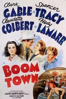 Boom Town is a 1940 American Western film starring Clark Gable, Spencer Tracy, Claudette Colbert, and Hedy Lamarr, and directed by Jack Conway. The supporting cast features Frank Morgan, Lionel Atwill, and Chill Wills. A story written by James Edward Grant in Cosmopolitan magazine entitled "A Lady Comes to Burkburnett" provided the inspiration for the film.[2] The film was produced and released by Metro-Goldwyn-Mayer.