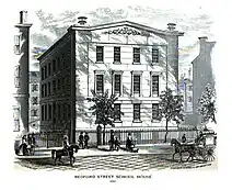 Third BLS school house on Bedford Street was built 1844 and shared the site with English High