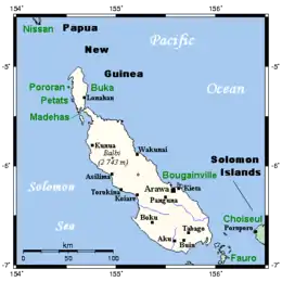 Bougainville Island (Tok Pisin: Bogenvil)[1] is the main island of the Autonomous Region of Bougainville, which is part of Papua New Guinea. It was previously the main landmass in the German Empire-associated North Solomons. Its land area is 9,300 km2 (3,600 sq mi). The population of the whole province, including nearby islets such as the Carterets, is approximately 300,000 (2019 census). The highest point is Mount Balbi, on the main island, at 2,715 m (8,907 ft). The much smaller Buka Island, c. 500 km2 (190 sq mi), lies to the north, across the 400–500 m (1,300–1,600 ft) wide Buka Strait. Even though the strait is narrow, there is no bridge across it, but there is a regular ferry service between the key settlements on either side. The main airport (or airstrip) in the north is in the town of Buka.
