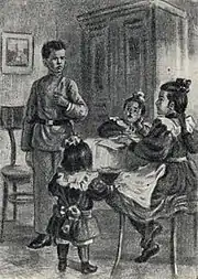 The boys' absence is discovered the next day, when it's time to lunch. A search, made throughout the village, brings no result, and the family is desperate. It's only the following morning that the policeman arrives with some papers to be signed, and after him a posting sleigh, transporting the fugitives back home, to everybody's delight. It turns out that the two had been stopped at the hotel in the town, where they were going about asking people where they could buy gunpowder for a pistol that they'd been able to procure beforehand. Chechevitsyn, as an established instigator, is being sent home, but only after he leaves an autograph in the awe-stricken Katya's journal: "Montezuma the Hawk Claw".