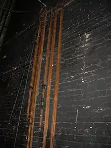 In theater, a brace is a sliding piece of wood or metal with a 'butterfly' winged nut to make it longer or shorter to fit the flat used to stabilize a flat set piece such as a flat. The nut is used, so that it can be changed more quickly than a screw to the floor during a quick change. Usually, a brace is painted black to make it less noticeable to the audience. Braces are often used to form a triangle between two perpendicular items (like a vertical flat and a stage. They can also make a flat piece stronger by forming an X-shape between all four corners. Another way to brace a rectangular flat is to use special braces, called toggles which run at regular intervals, parallel to the short end of the flat, effectively breaking it into many smaller, stronger rectangles.