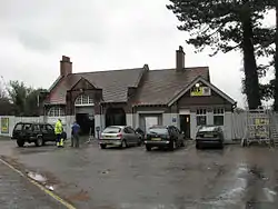 The station was a variation on the standard island platform design typical of the London Extension, and here it was the more common "cutting" type reached from a roadway (the A43), that crossed over the line. The cutting itself was substantial and typical of the line, involving the excavation of some 336,000 cubic yards (256,892 cubic metres) of material.[2] The original intention was for the station entrance to be located on the bridge itself, as it was at numerous other stations on the line, but local concerns about traffic congestion forced a change in the layout, the entrance being relocated at the top of the cutting on the west side in a lay-by off the road, with a footbridge leading across to the platform [3] (Hucknall Central had a similar arrangement, only there the entrance was on the east side). Although the town of Brackley had a population of barely 2,500 at the time, it was considered a sufficiently large and important settlement for the station to be provided with a more extensive range of platform buildings and facilities beneath a longer awning, as at Woodford Halse and Rugby Central.
