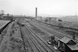 Previously, Huddersfield had been by-passed by the existing east–west route, the Manchester and Leeds Railway which had opened in 1840.[2] That line instead had closely followed the even gradients of the River Calder, which left Huddersfield to be served with a station at Cooper Bridge about 4 miles (6.4 km) distant. The new line ran through the town itself, with Bradley station to the east of it, where the line divided to meet the existing Manchester and Leeds route in a triangular junction, allowing trains to continue on eastwards via Mirfield towards Dewsbury, Wakefield and Leeds, or westwards via Brighouse up the Calder valley.[3]
