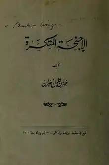 Broken Wings (Arabic: الأجنحة المتكسرة, romanized: al-ajniḥa al-mutakassira) is a poetic novel or novella written in Arabic by Kahlil Gibran and first published in 1912 by the printing house of the periodical Meraat-ul-Gharb in New York. It is a tale of tragic love, set at the turn of the 20th century in Beirut. A young woman, Selma Karamy, is betrothed to a prominent religious man's nephew. The protagonist (a young man that Gibran perhaps modeled after himself) falls in love with this woman. They begin to meet in secret, however they are discovered, and Selma is forbidden to leave her house, breaking their hopes and hearts.[1]