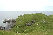 The foundations of the castle are on the landward end of a long rocky promontory about 1⁄4 mile (400 m) north of the east end of the hamlet of Brough. A trench some 40 feet (12 m) wide and 10 to 12 feet (3 to 4 m) deep has been dug across the neck and on either side of the rock; in rear of it has been a range of buildings separated by a narrow courtyard or passage. The keep is not recognisable. The promontory tails away seawards to a shelf of rock. There appears to be no history of this castle.[1]