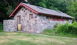 Buffalo River State Park was created in the late 1930s, taking advantage of federal job creation programs during the Great Depression. The Moorhead Rod and Gun Club championed the site and the Minnesota Legislature officially added it to the state park system in 1937.[6] At the time it was the only state-owned recreational facility in the region.[5] The Works Progress Administration (WPA) established a camp and began developing the park's original 122 acres (49 ha). WPA workmen established infrastructures like the swimming area, entrance road, parking area, water supply, and toilets.[6] They also built a bathhouse, a latrine, and a diversion dam in the National Park Service rustic style using split stone and logs.[5]