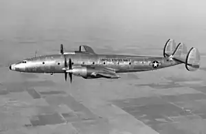 The Constellation's wing design was close to that of the Lockheed P-38 Lightning, differing mostly in size.[5] The triple tail allowed the aircraft to fit into existing hangars,[4] while features included hydraulically boosted controls and a deicing system used on wing and tail leading edges.[2] The aircraft had a maximum speed over 375 mph (600 km/h), faster than that of a Japanese Zero fighter, a cruise speed of 340 mph (550 km/h), and a service ceiling of 24,000 ft (7,300 m).