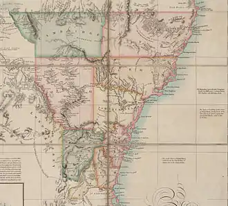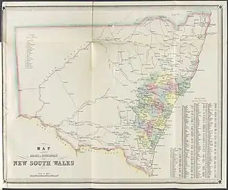 • Maneroo District (south coast, now called Monaro) - south of the Moruya River and Queanbeyan River, and east of the Murrumbidgee River. Erected 22 May 1839 (1841 population of 1554, with 230,130 sheep, 78,473 cattle and 2133 horses).[7] In 1852, it was described as having 400,000 sheep, 115,000 cattle and 5,000 horses.[8]